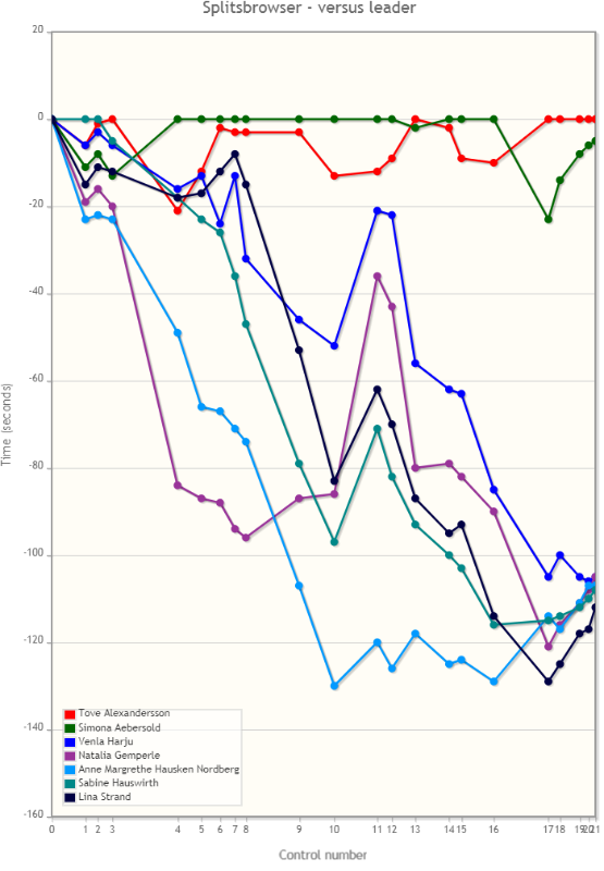 Das Gegenteil ist der Fall. Tove Alexandersson hat auf der Schlussschlaufe an Tempo eingebüsst und profitierte von der eingeholten Anne Margrethe Hausken Nordberg, welche den Lead hatte. Sie rettete einen minimalen Vorsprung gerade noch über die Ziellinie. Simona Aebersold verlor Gold auf der Schlussschlaufe aufgrund einer suboptimalen Route zu Posten 17, welche Sie 30 Sekunden kostete (Siehe angehängte Grafik).