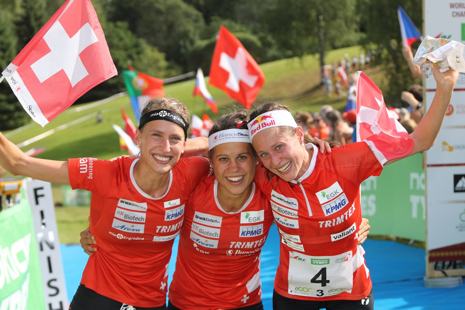 • SIGULDA/LATVIA, 09.08.2018 - Switzerland wins Relay Gold with the Women FLTR: Elena Roos, Julia Jakob & Judith Wyder, captured during the Flower Ceremony of the Relay at the World Orienteering Championships WOC 2018 in Sigulda (Latvia). copyright by www.steineggerpix.com + Swiss Orienteering / photo by remy steinegger #woc2018 #swissorienteering #orienteering #steineggerpix.com