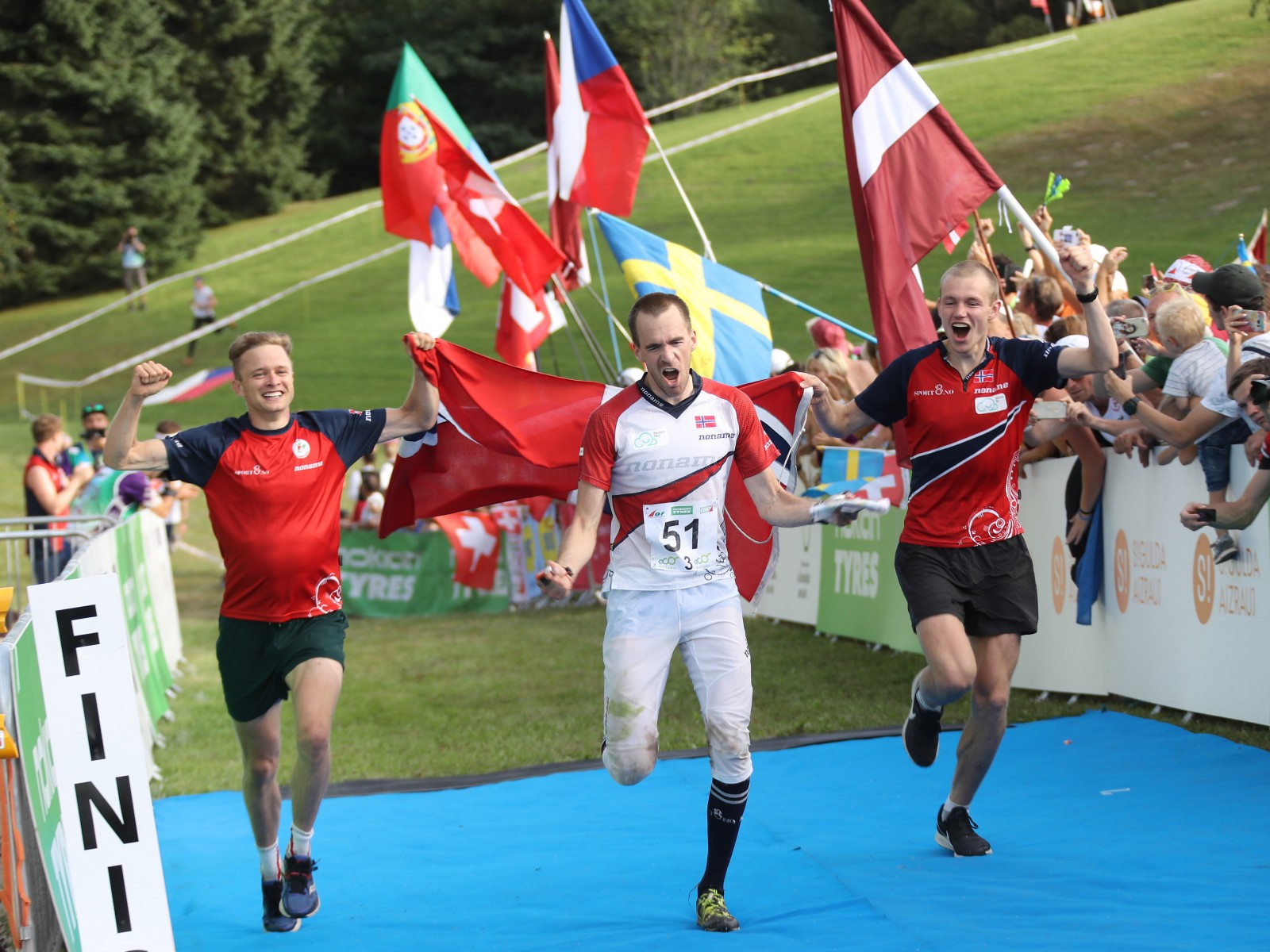 RSTXII 250890 SIGULDA/LATVIA, 09.08.2018 - Norway wins Relay Gold with the Men FLTR: Hallan Steiwer Gaute, Magne Daehli & Eskil Kinneberg, captured after the Flower Ceremony of the Relay at the World Orienteering Championships WOC 2018 in Sigulda (Latvia). copyright by www.steineggerpix.com + Swiss Orienteering / photo by remy steinegger #woc2018 #swissorienteering #orienteering #steineggerpix.com