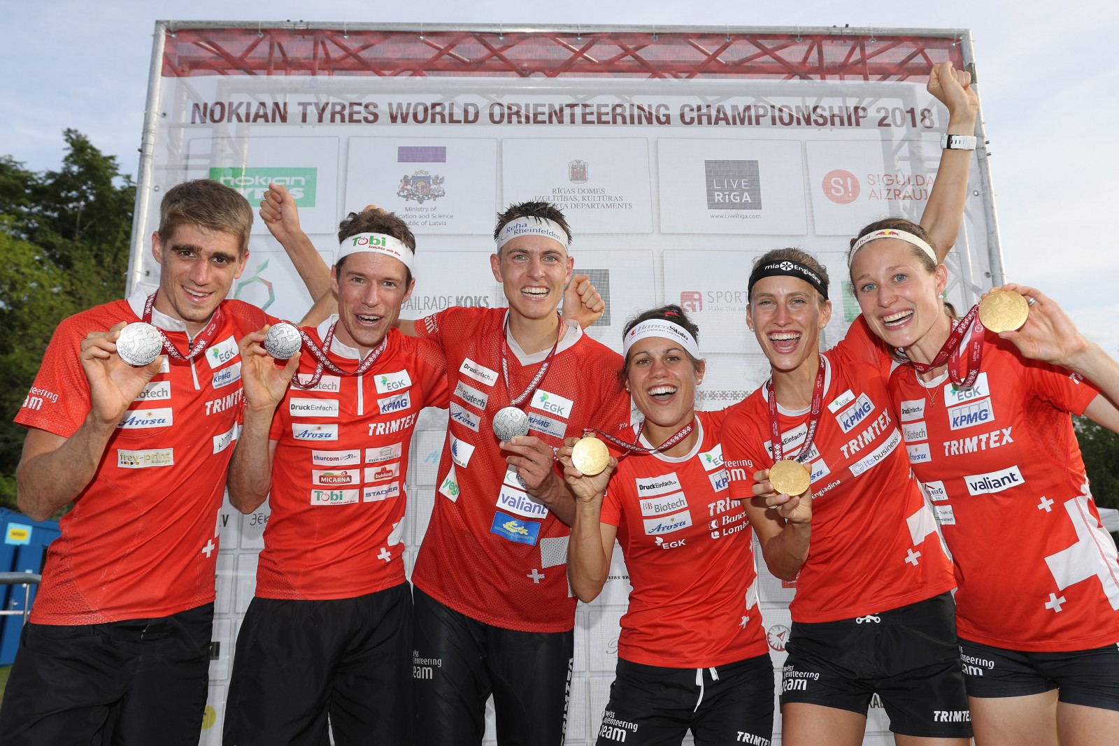 RSTXII 251015 SIGULDA/LATVIA, 09.08.2018 - Switzerland wins Relay Gold with the Women and Silver with the Men: FLTR: Florian Howald, Daniel Hubmann, Matthias, Kyburz, Elena Roos, Julia Jakob & Judith Wyder captured after the Flower Ceremony of the Relay at the World Orienteering Championships WOC 2018 in Sigulda (Latvia). copyright by www.steineggerpix.com + Swiss Orienteering / photo by remy steinegger #woc2018 #swissorienteering #orienteering #steineggerpix.com