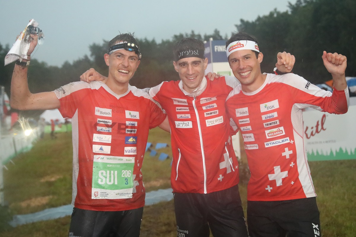 • HERMANKY/CZE, 08.07.2021 - Swiss Orienteers Matthias Kyburz, Florian Howald an Martin Hubmann (FLTR) win the bronce medal in the Relay at the Nokian Tyres World Orienteering Championships WOC 2021 in Doksy / Czech Republic. swiss-image.ch + swiss orienteering / Photo Remy Steinegger
