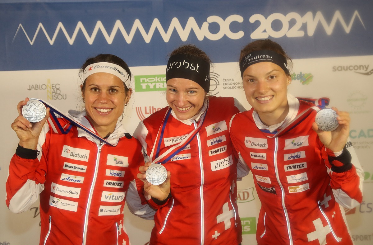 • HERMANKY/CZE, 08.07.2021 - Silver medal for Swiss Women Orienteers Elena Roos, Simona Aebersold and Sabine Hauswirth (FLTR) in the Relay at the Nokian Tyres World Orienteering Championships WOC 2021 in Doksy / Czech Republic. swiss-image.ch + swiss orienteering / Photo Remy Steinegger