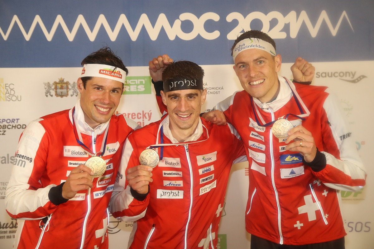 Medaillen Herren HERMANKY/CZE, 08.07.2021 - Swiss Orienteers Martin Hubmann, Florian Howald and Matthias Kyburz (FLTR) win the bronce medal in the Relay at the Nokian Tyres World Orienteering Championships WOC 2021 in Doksy / Czech Republic. swiss-image.ch + swiss orienteering / Photo Remy Steinegger