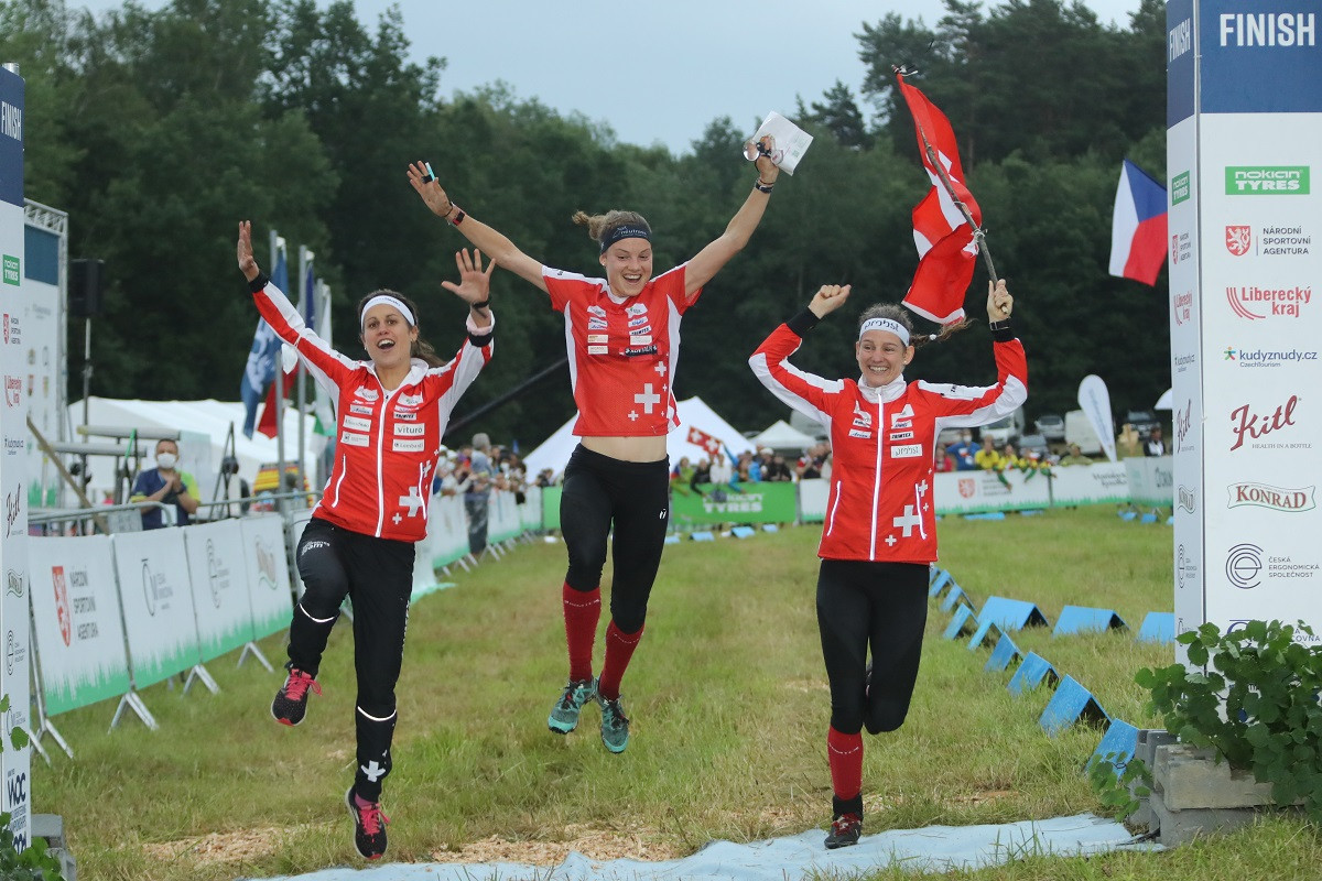 Zieleinlauf Damen HERMANKY/CZE, 08.07.2021 - Silver medal for Swiss Women Orienteers Elena Roos, Simona Aebersold and Sabine Hauswirth (FLTR) in the Relay at the Nokian Tyres World Orienteering Championships WOC 2021 in Doksy / Czech Republic. swiss-image.ch + swiss orienteering / Photo Remy Steinegger