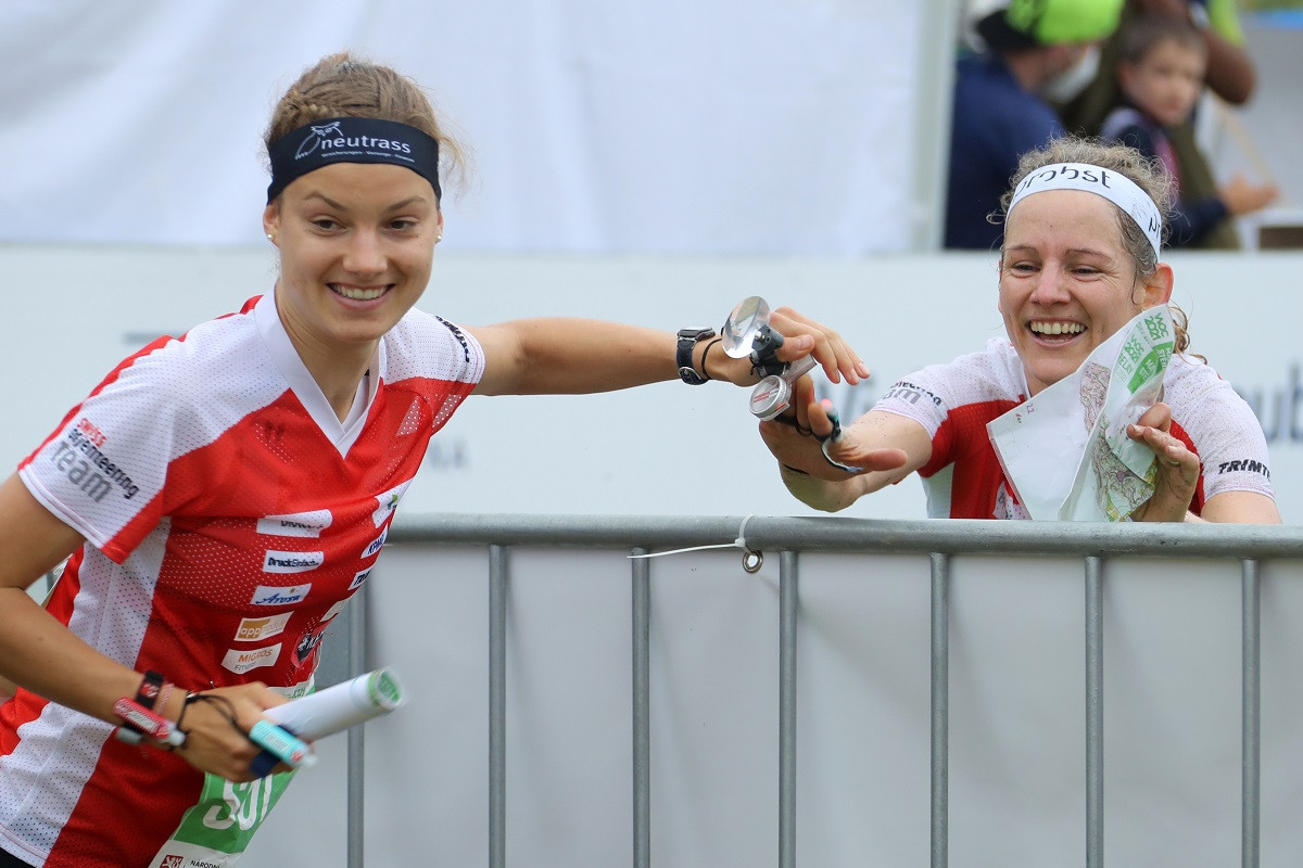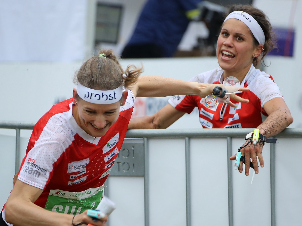 bergabe Sabine Hauswirth Simona Aebersold HERMANKY/CZE, 08.07.2021 - Sabine Hauswirth (SUI, R) changing to Simona Aebersold (SUI, L), captured during the Relay at the Nokian Tyres World Orienteering Championships WOC 2021 in Doksy / Czech Republic. swiss-image.ch + swiss orienteering / Photo Remy Steinegger