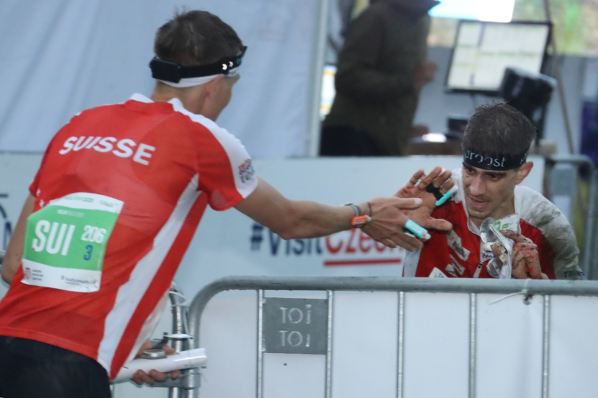 • HERMANKY/CZE, 08.07.2021 - Florian Howald (SUI, R) changing to Matthias Kyburz (SUI, L), captured during the Relay at the Nokian Tyres World Orienteering Championships WOC 2021 in Doksy / Czech Republic. swiss-image.ch + swiss orienteering / Photo Remy Steinegger