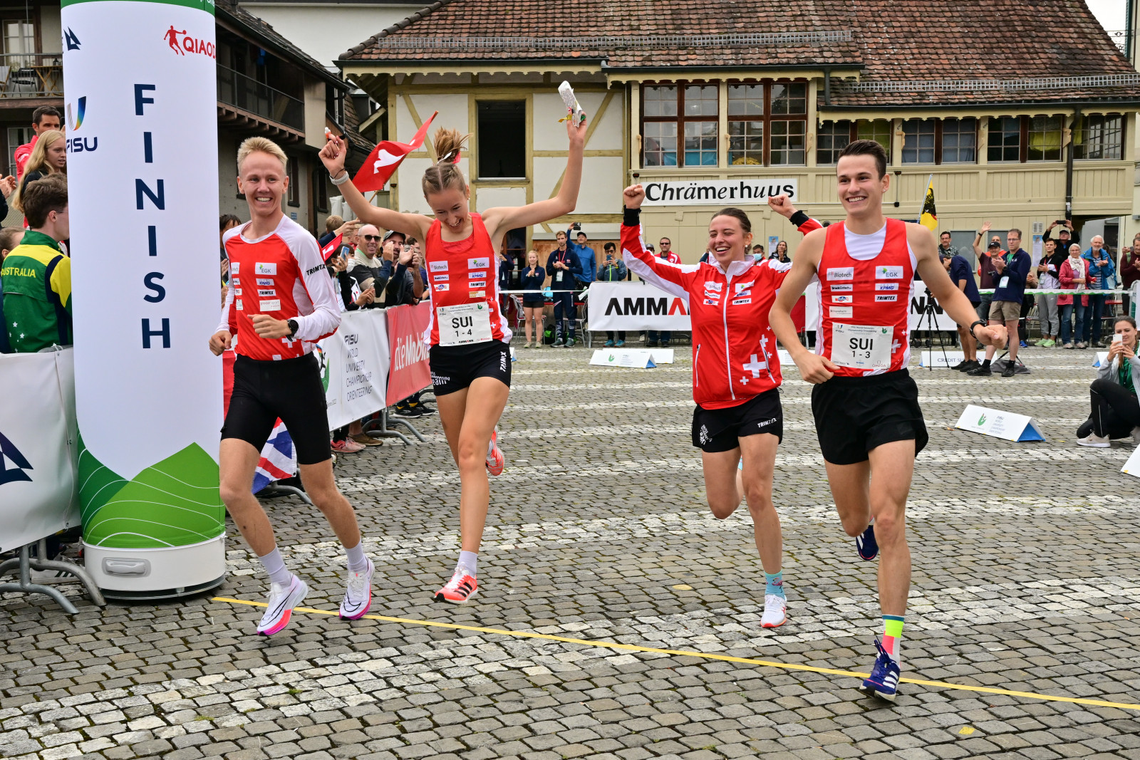 LANGENTHAL, 19AUG22 - Swiss team on the way to the gold medal (Timo Suter, Eline Gemperle, Deborah Stadler, Tino Polsini) captured during the FISU World University Championship Orienteering Sprint Relay race taking place in Langenthal/Switzerland 19 August 2022.