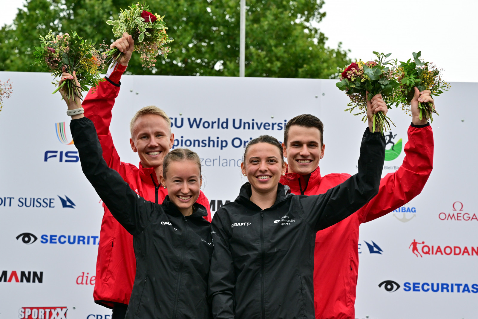 LANGENTHAL, 19AUG22 - Swiss Team (Timo Suter, Eline Gemperle, Deborah Stadler, Tino Polsini) captured during the flower ceremony at the FISU World University Championship Orienteering Sprint Relay taking place in Langenthal/Switzerland 19 August 2022.
