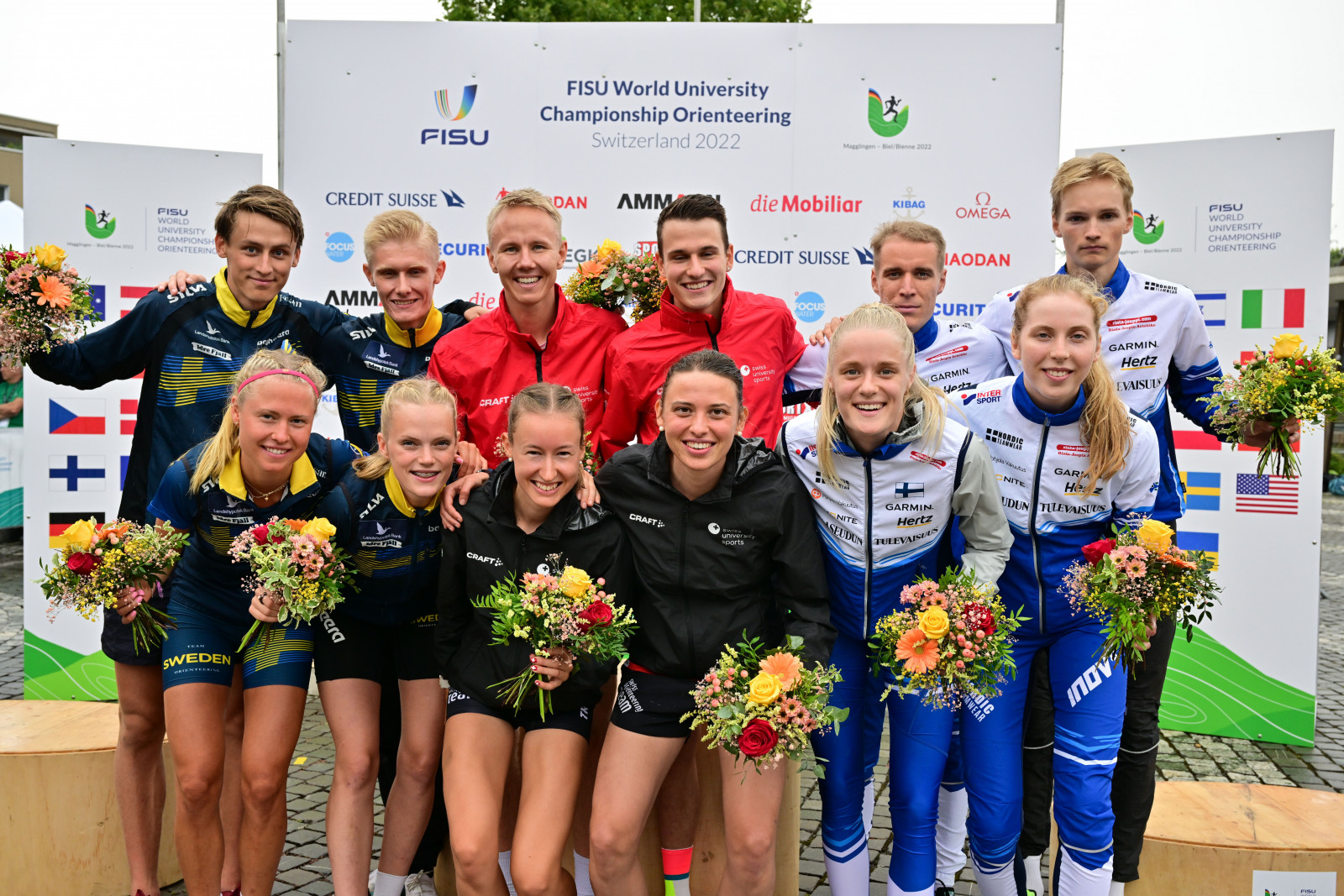 LANGENTHAL, 19AUG22 - Medal winners (SWE, SUI, FIN) captured during the flower ceremony at the FISU World University Championship Orienteering Sprint Relay taking place in Langenthal/Switzerland 19 August 2022.