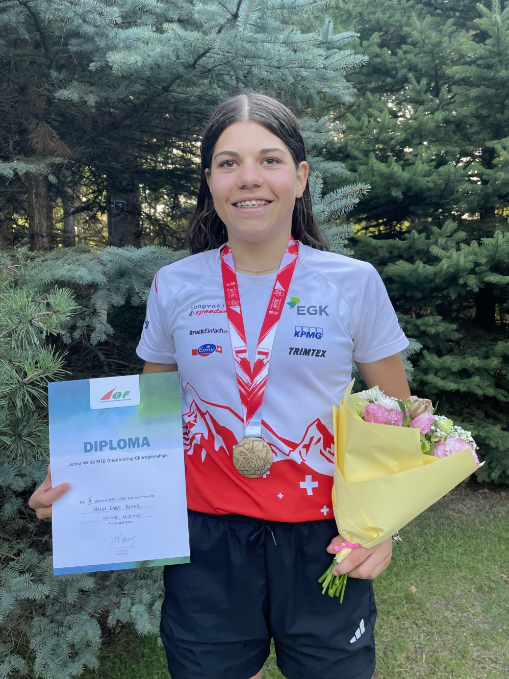 Nach der Enttäuschung des Vortages schlug Juniorin Malin Röhrl eindrucksvoll zurück und sicherte sich - wie schon im Sprint - die Bronzemedaille. Beim Zielinterview mit Sabrina Meister machte sie auch dementsprechend einen fröhlicheren Eindruck: „Mir gelang ein sehr guter Lauf. Es war von Anfang an mega hart. Vor allem zum ersten Posten war „ein Megaspeed drauf“ und man musste dranbleiben.“ Den Verlauf des weiteren Rennens beschreibt sie wie folgt: „Auf den ersten Schlaufen war ich alleine unterwegs, erst nach dem zweiten Sammelposten und den darauffolgenden Loops war ich zu zweit unterwegs mit der Fahrerin, welche bis jetzt zweimal Gold gewonnen hatte (der Tschechin Adela Ryglova) und ich wusste, die ist mega gut, bei der muss ich bleiben, was mir gelang.“ Auf den letzten Metern pushte die grossgewachsene Tschechin dann nochmals richtig, so dass es Röhrl „richtig verblasen“ hat. Bis ins Ziel verlor sie so noch drei Sekunden, war aber mit dem Erreichen ihrer zweiten Bronzemedaille mehr als zufrieden.