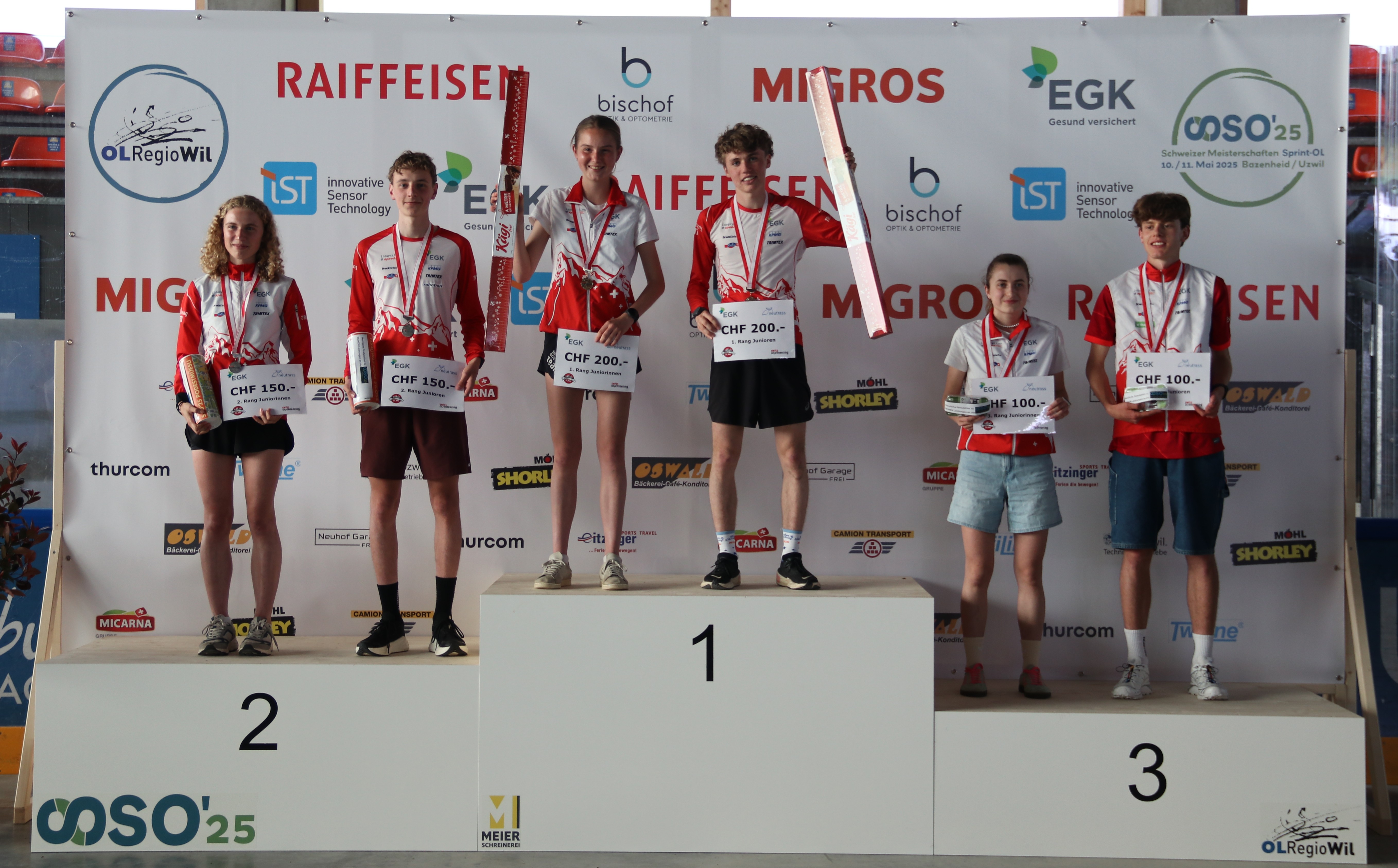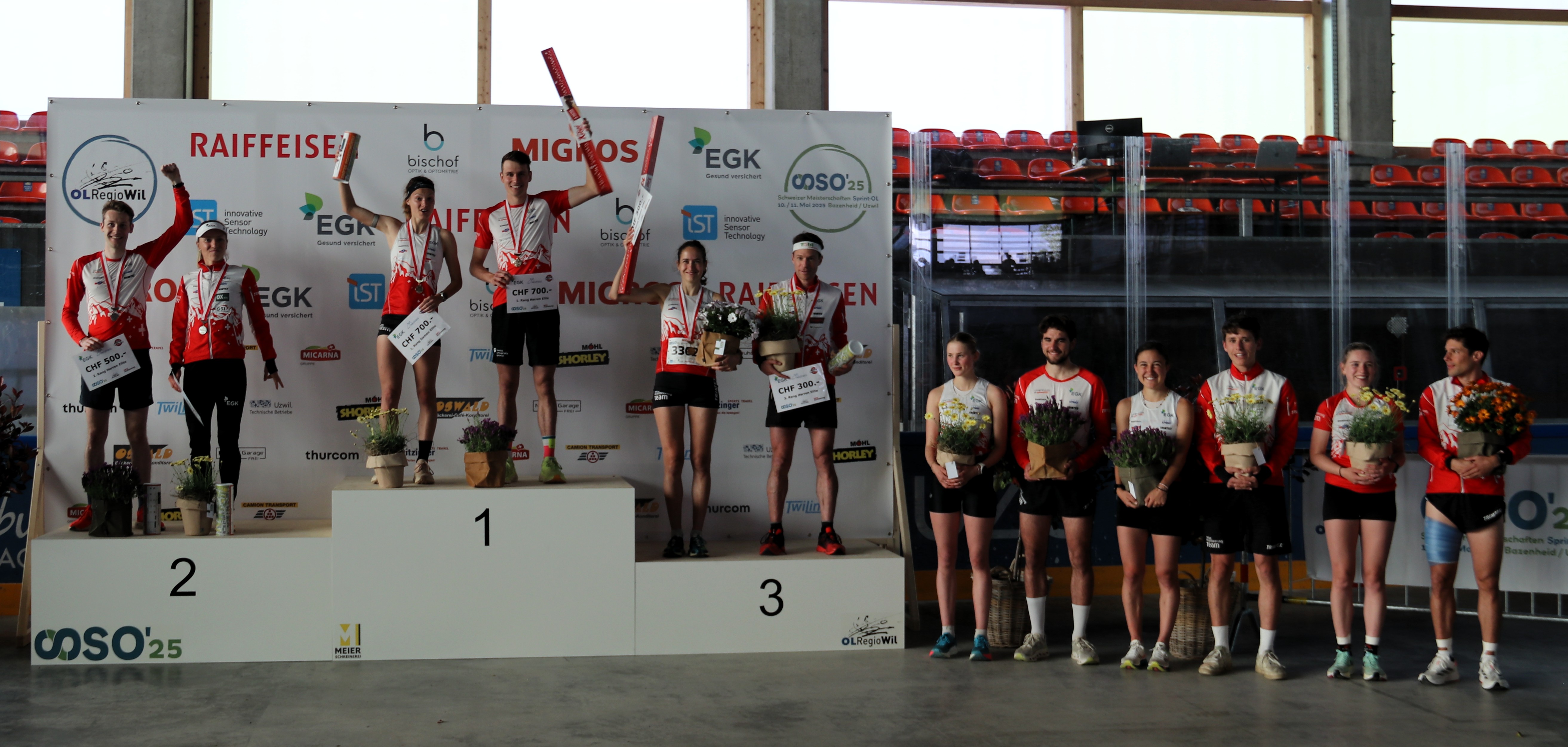 Natalia Gemperle und Paula Gross komplettierten das Podest bei den Damen. Gemperle lieferte sich ein Kop-an-Kopf-Rennen mit Aebersold, während Gross elf Sekunden – und einige Handschläge mit dem begeisterten Publikum – später die Ziellinie überquerte. Bei den Herren fiel die Entscheidung nicht ganz so knapp aus. Der amtierende K.o.-Sprint-Weltmeister Riccardo Rancan läuft fünf Sekunden nach Polsini ins Ziel, der OL-Regio-Wil-Läufer Daniel Hubmann – dessen Verein für die Organisation verantwortlich war – fünfzehn Sekunden später. Martin Hubmann musste aufgrund einer Verletzung den Final abbrechen.