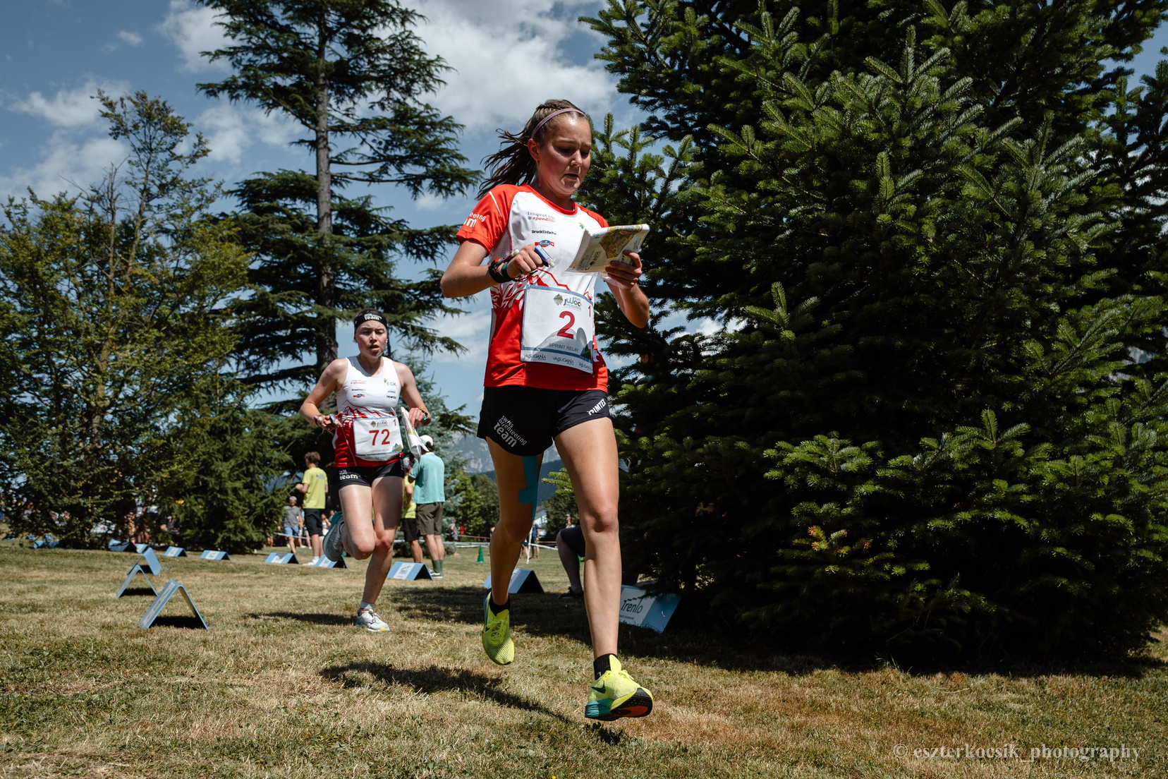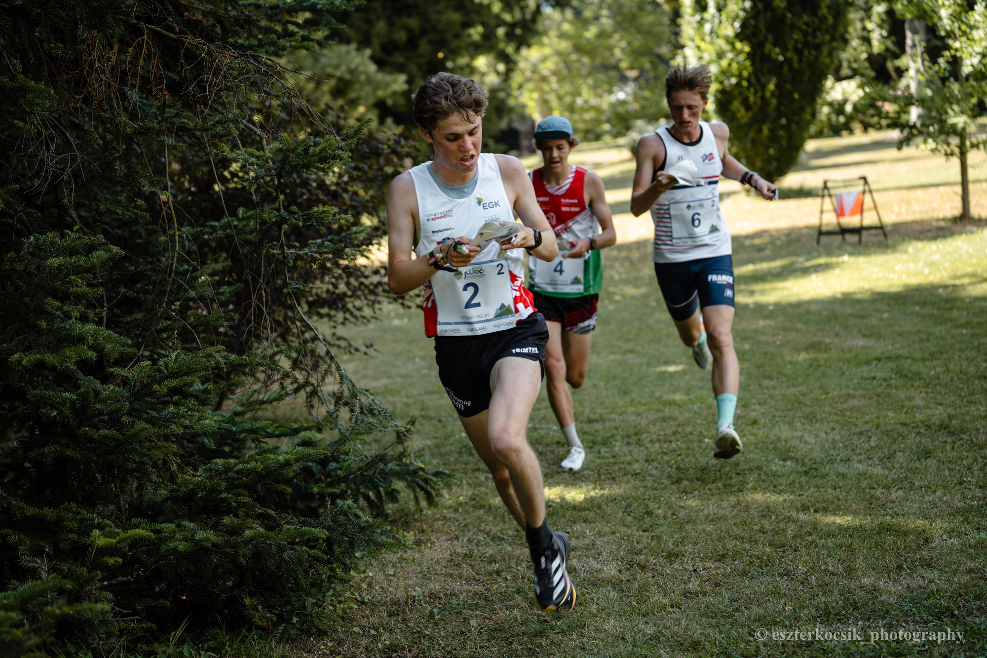In brütender Hitze – laut meteoblue.com betrug die gefühlte Temperatur 38 °C – liefen die Juniorinnen und Junioren mit der Sprintstaffel den ersten Wettkampf der diesjährigen JWOC. Die Bahnen beinhalteten spannende Routenwahlen und einen physisch und mental sehr anspruchsvollen Schlussteil. Die stechende Sonne und die Steigung liessen einige Athletinnen und Athleten an ihre Grenzen stossen.