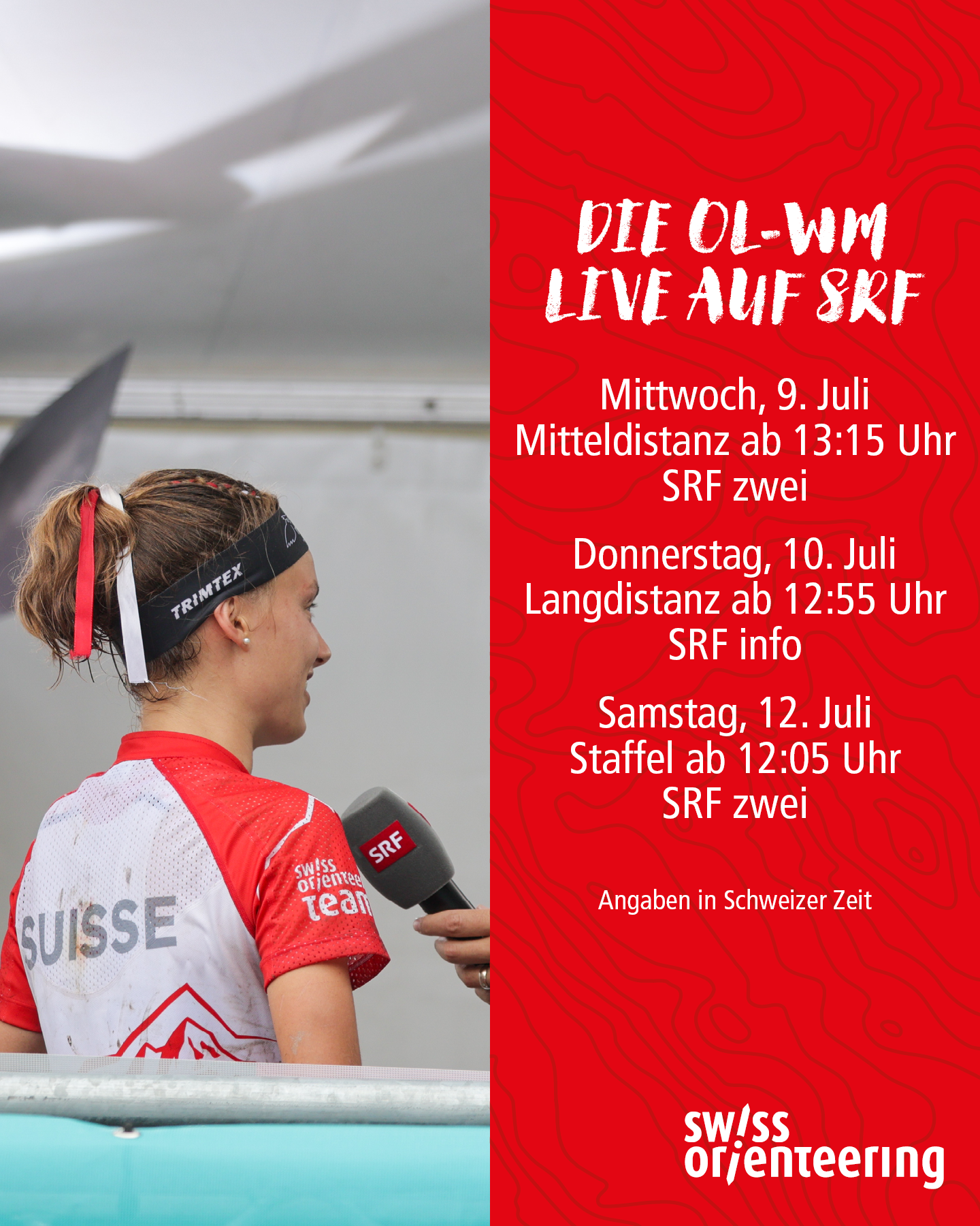 Alle Medaillenentscheidungen werden live auf SRF zwei/info gezeigt. Durch die Rennen führt Kommentator Reto Held gemeinsam mit Expertin Simone Niggli (Mitteldistanz und Staffel) sowie Experte Matthias Niggli (Langdistanz).