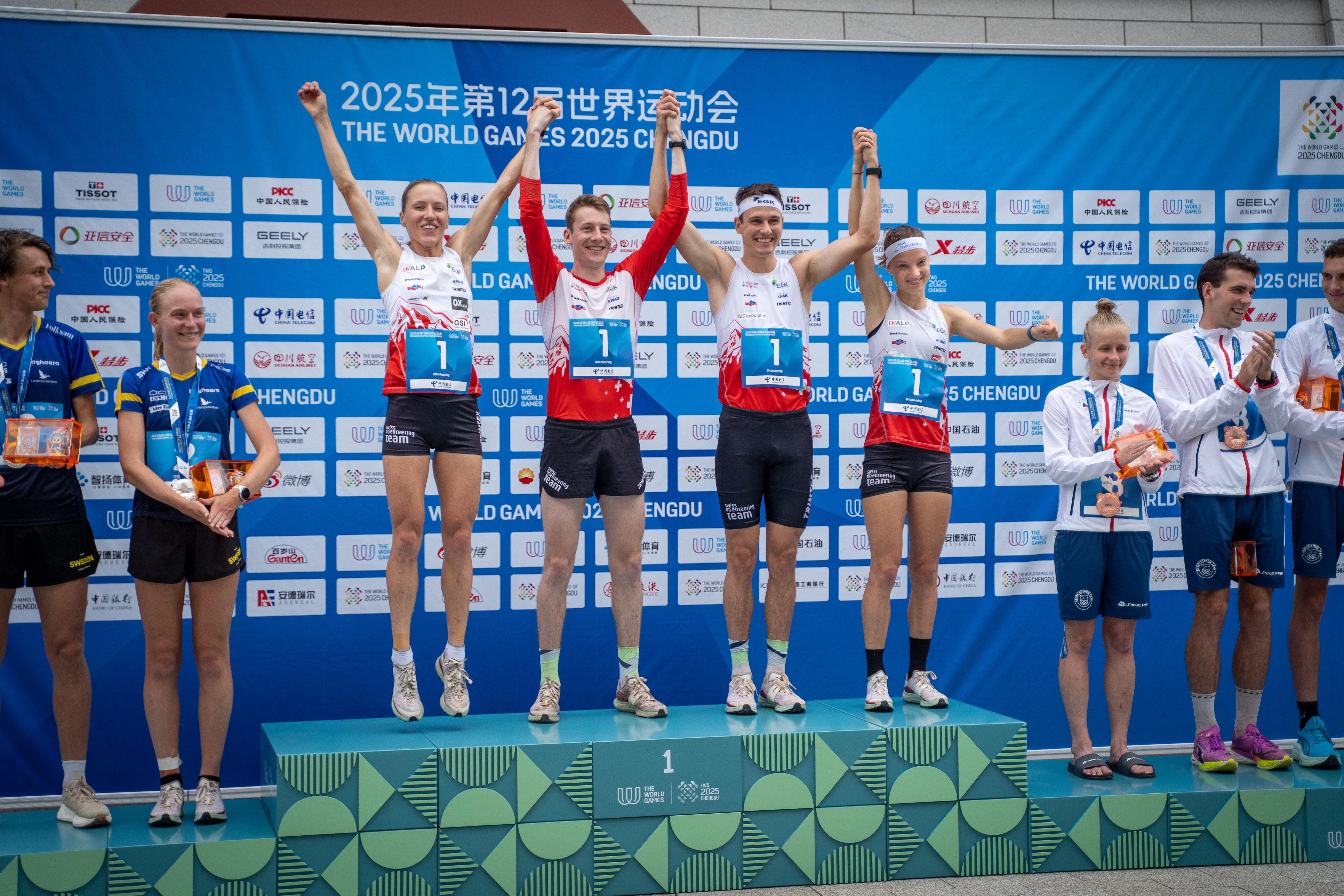 Die Schweizer Startläuferin Natalia Gemperle löste ihre Aufgabe souverän. Nachdem sie bis zum Überlauf noch etwas Rückstand hatte, konnte sie mit einem starken Schlussteil die Führung übernehmen und übergab mit rund 10 Sekunden Vorsprung an Riccardo Rancan. Er kam jedoch nicht fehlerfrei durch seine Ablösung durch und läuft am Ende an vierter Position zur Übergabe, 20 Sekunden hinter dem führenden Team aus Neuseeland. Auch Tino Polsini auf der dritten Strecke verpasste einen Eingang und konnte dadurch keine Plätze gutmachen und so schickte er Schlussläuferin Simona Aebersold auf Rang 4 mit 40 Sekunden Rückstand auf das mittlerweile führende schwedische Team auf die Strecke. Die zweifache Goldmedaillengewinnerin der diesjährigen World Games erwischte zwar keinen optimalen Start, konnte dann aber kontinuierlich Zeit gutmachen und so reichte es am Ende zu einem knappen Sieg fürs Schweizer Quartett. Fünf Sekunden dahinter gewinnt Schweden mit Emma Bjessmo, Jonatan Gustafsson, August Mollen und Alva Sonesson Silber, Bronze geht an Tschechien mit Denisa Kralova, Jakub Glonek, Tomas Krivda und Tereza Rauturier.