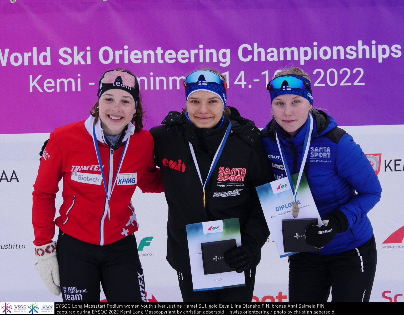 Eine hervorragende Leistung an den Tag legte Justine Hamel an der Jugend-EM. Die Neuenburgerin gewann die Silbermedaille. Es sei ihr sehr gut gelaufen, meinte die frischgebackene Vizeeuropameisterin im Ziel. «Auf der zweiten von insgesamt zwei Schlaufen lief ich mit einer Finnin. Gemeinsam konnten wir das Tempo hochhalten und am Ende konnte ich sie mit einer etwas direkteren Mikroroutenwahl sogar noch distanzieren,» blickt Hamel auf das Rennen zurück. Das dritte Diplom im dritten Rennen holte sich Elin Neuenschwander. Mit dem heutigen 6. Rang legt die Bernerin eine beeindruckende Konstanz an den Tag und dies obwohl sie im heutigen Massenstartrennen fast den ganzen Lauf alleine absolvieren musste. Auch Seline Sannwald und Nesa Schiller, die beide das erste Mal auf internationaler Ebene laufen, dürfen mit den Rängen 10 und 13 zufrieden sein.