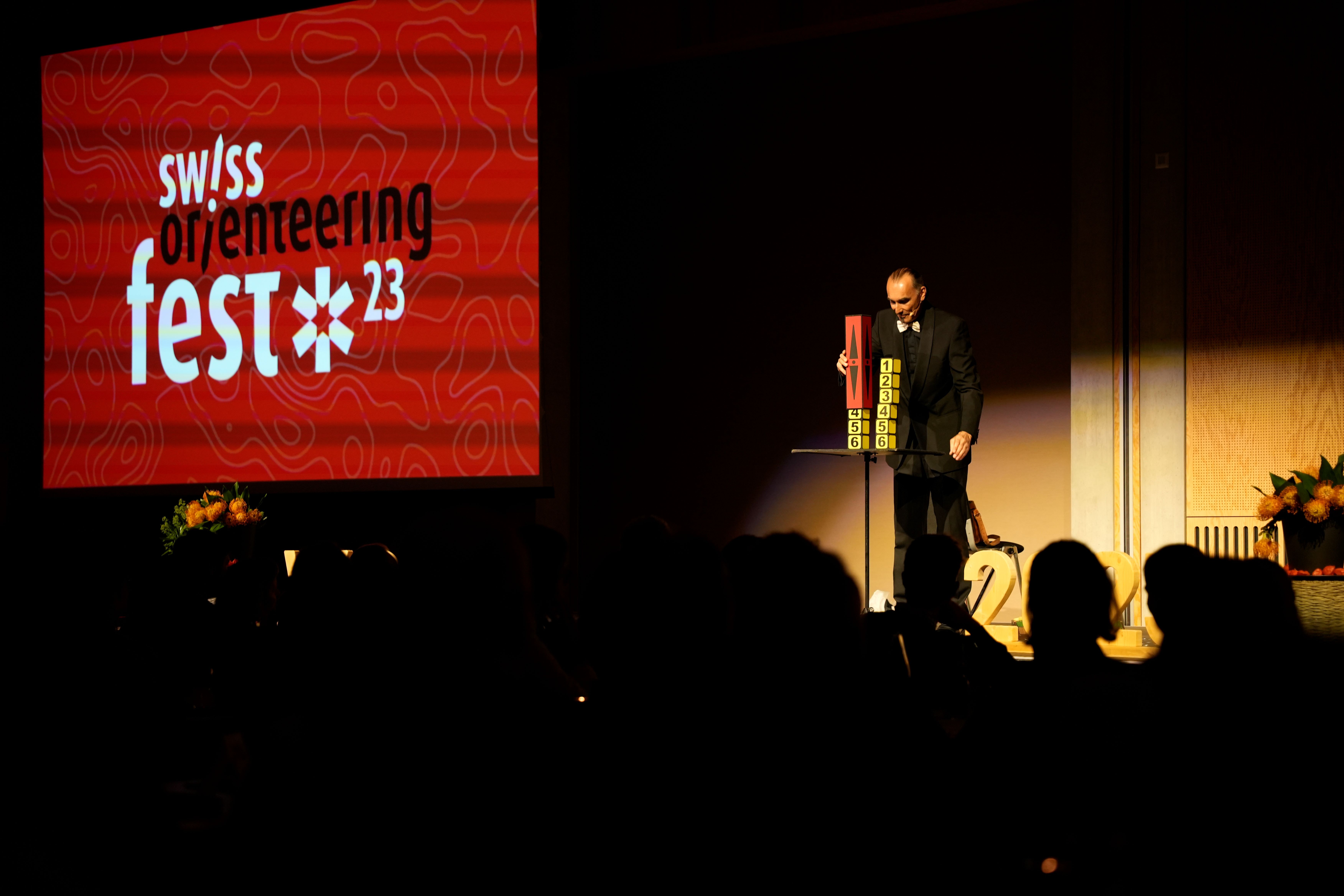 Nach der Action der Eliteathletinnen und -athleten lud Swiss Orienteering zum Fest. In der grossen Eventhalle des Campus Sursee sammelten sich die rund 400 feierlich gekleideten Ski-, Bike- und Fuss-OL-Begeisterten um die (Breitensport-)Erfolge der OL-Saison 2023, die internationalen Medaillen, die Rücktritte der A-Kader-Athlet*innen Florian Howald, Elena Howald-Roos und Sabine Hauswirth und der Trainer Jonas Geissbühler und Philip Sauter sowie die Heim-WM zu feiern. An Magie glauben liessen einem nicht nur die vielen Erfolge und Leistungen, sondern auch der Zauberer Christoph Borer, wie er einen Geldschein in eine Zitrone zauberte oder eine Zuschauerin Berührungen spüren liess, die er mit mehreren Metern Abstand in die Luft tippte.