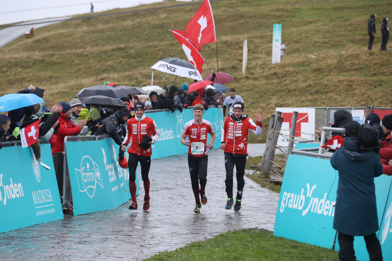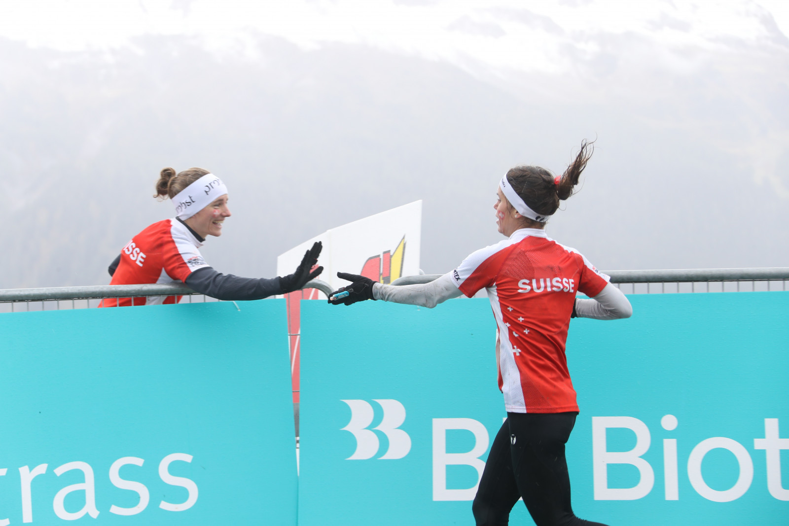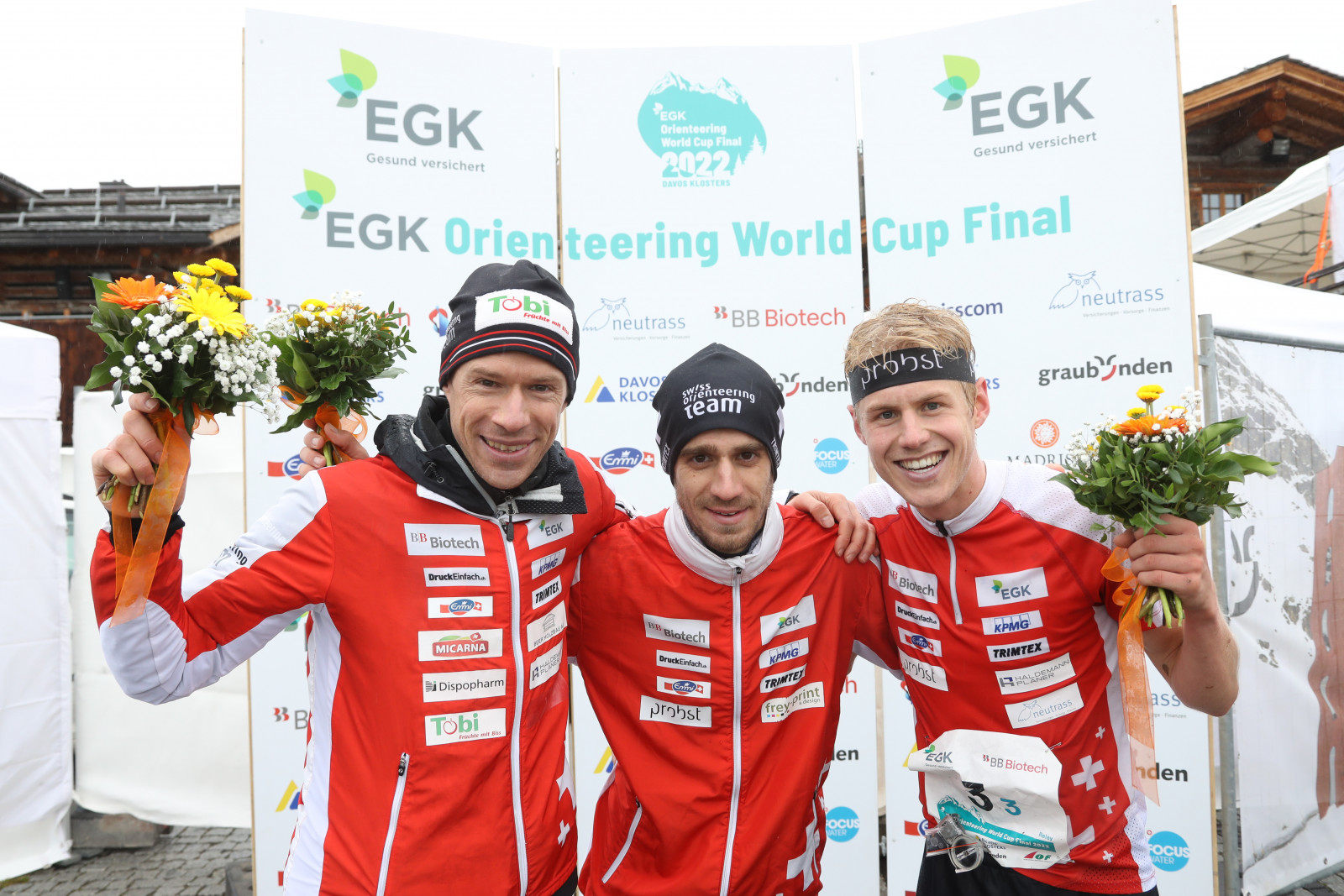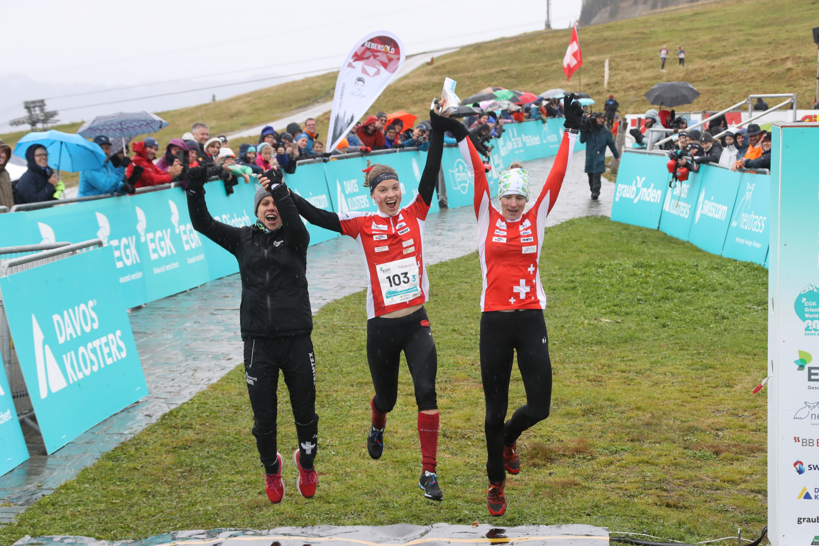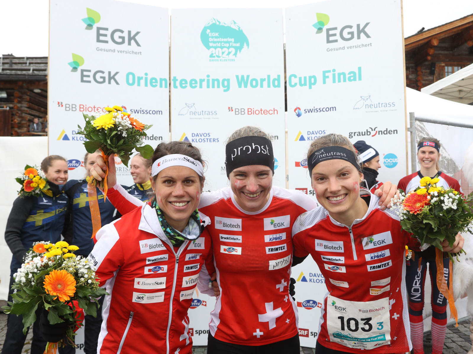 DAVOS-KLOSTERS/SWITZERLAND, 01.10.2022 - FLTR Elena Roos, Sabine Hauswirth and Simona Aebersold Switzerland 1, winning the Relay Women at the EGK Orienteering World Cup Final on Madrisa, Klosters, Switzerland.