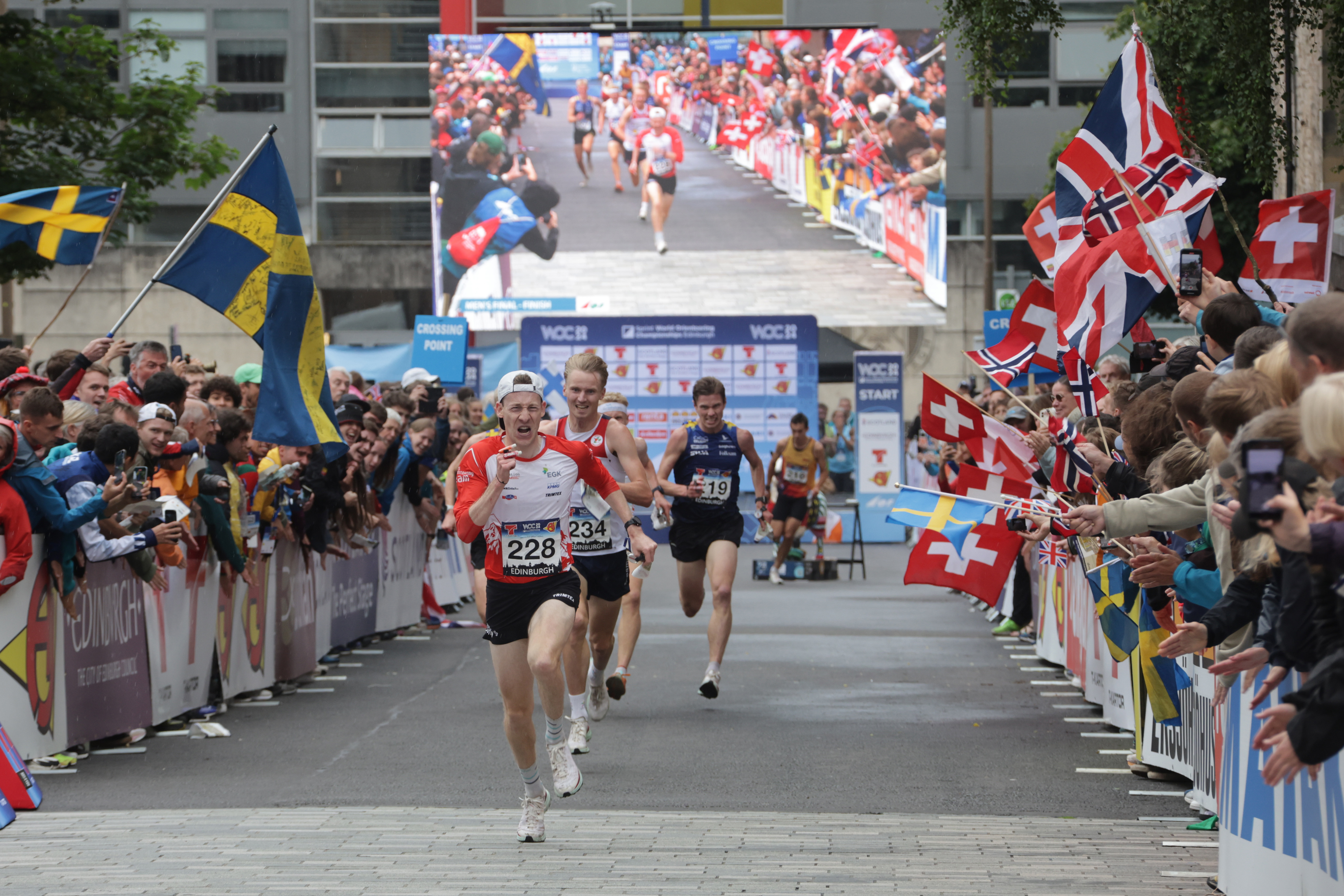 Après que les six athlètes suisses au départ aient passé les qualifications dans la périphérie de la capitale écossaise, la finale du sprint à élimination directe se déroulait au centre d'Edimbourg pour clore les championnats du monde de course d'orientation de cette année. Des quarts de finale à la finale en passant par la demi-finale, il s'agissait de passer tour après tour en duel direct avec les autres athlètes. Après l'élimination de Paula Gross, Natalia Gemperle et Timo Suter en demi-finale, Simona Aebersold, Joey Hadorn et Riccardo Rancan, trois Suisses, se sont retrouvés en finale parmi les six meilleurs.