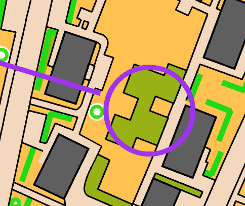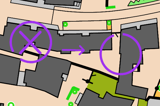 Sur le terrain, les zones interdites facilement praticables ne doivent pas être utilisées directement pour le choix des itinéraires. Cela mène généralement à ce que plus d’un coureur traverse la zone interdite et se termine par des discussions désagréables avec les propriétaires.