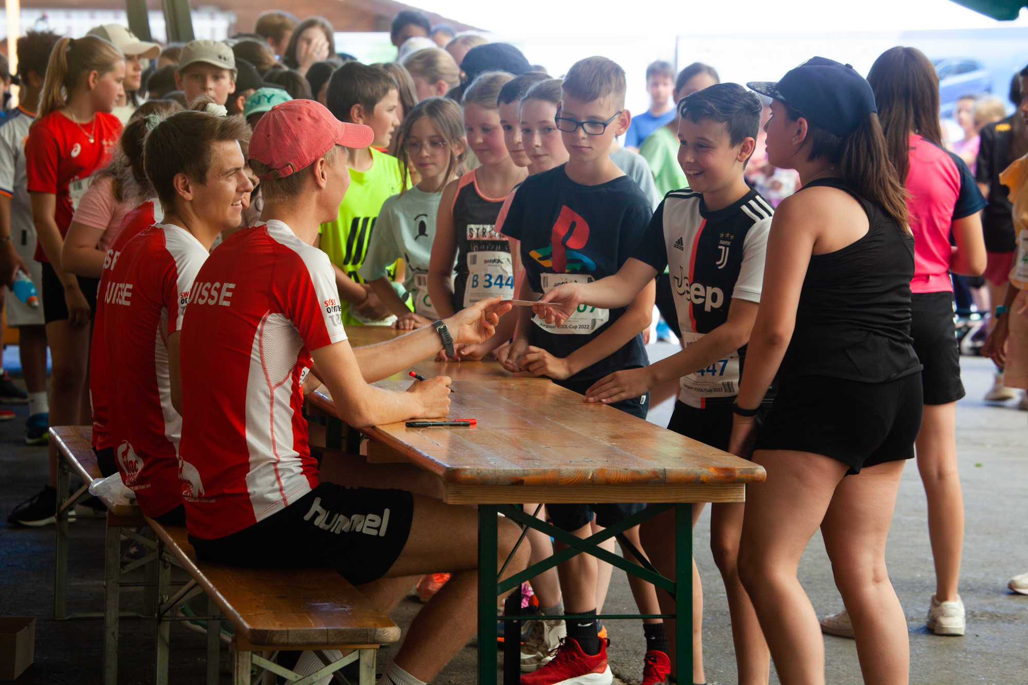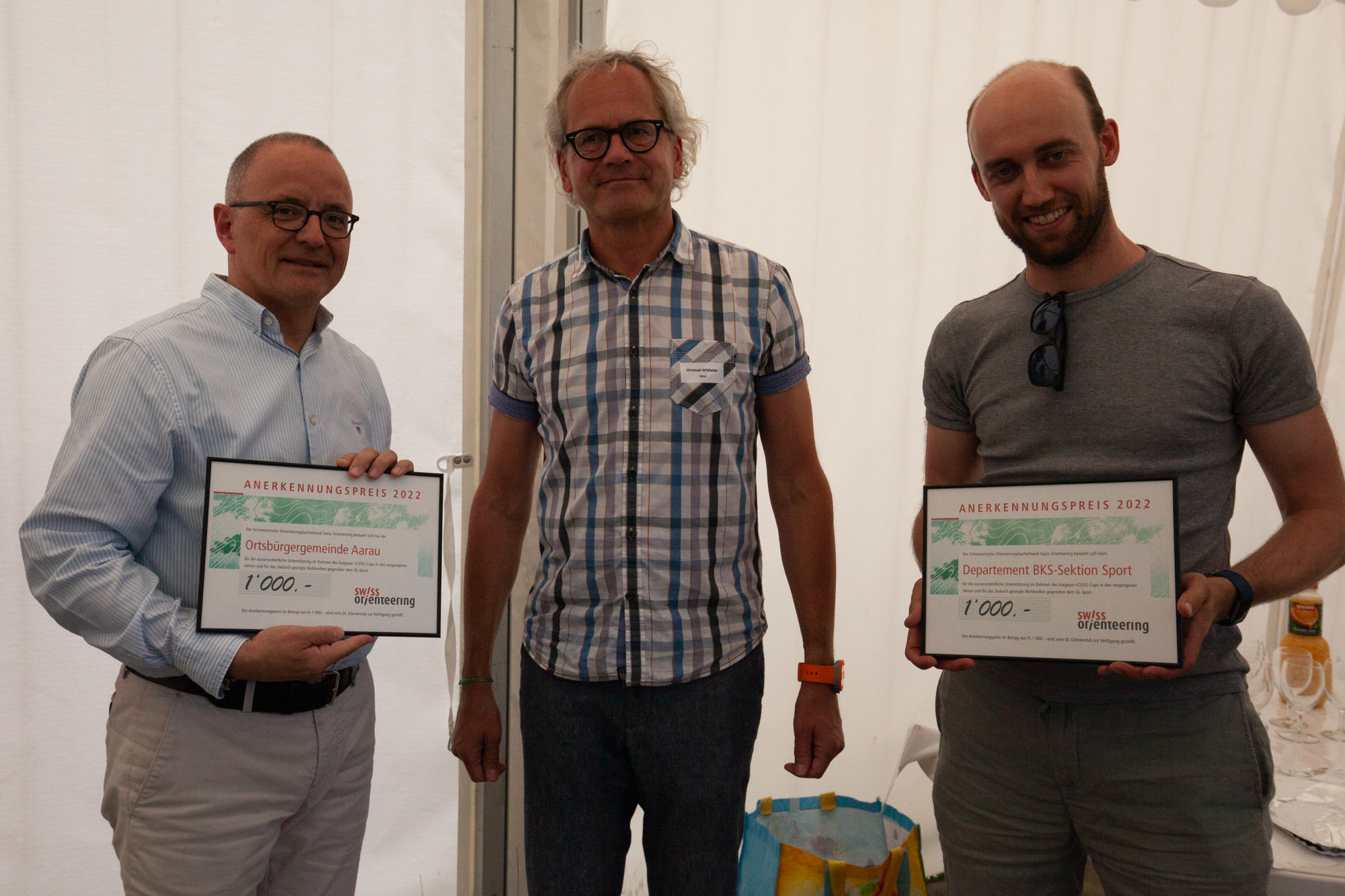 Les invités d'honneur se sont également réjouis de la réussite de l'événement. Tous les discours ont souligné l'importance de cette journée sportive pour une vie scolaire en mouvement. Le point culminant de la visite guidée des invités a été la remise par Christoph Wildhaber, membre du comité central de Swiss Orienteering, du prix de reconnaissance 2022 du club des bienfaiteurs de la course d'orientation. La commune bourgeoise d'Aarau et le BKS ont été honorés par un chèque provenant du fonds du club des bienfaiteurs de la course d'orientation. Selon lui, ce prix vise à reconnaître l'engagement d'institutions ou de personnes actives en dehors de la scène de la course d'orientation, mais qui y apportent une contribution importante. Le maire d'Aarau, Hanspeter Hilfiker, a reçu ce prix d'honneur avec joie et surprise. Il a félicité l'Aargauer OL Verband pour ses nombreuses activités et ses manifestations toujours très bien organisées et a promis que l'association, qui fait preuve d'initiative, pourrait à l'avenir également jouir d'un droit d'hospitalité dans et autour du Schachen d'Aarau. Simon Best, du BKS, a également résumé brièvement la situation : "Merci - c'est bien que vous fassiez bouger autant d'écoliers chaque année !"