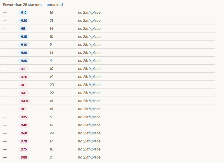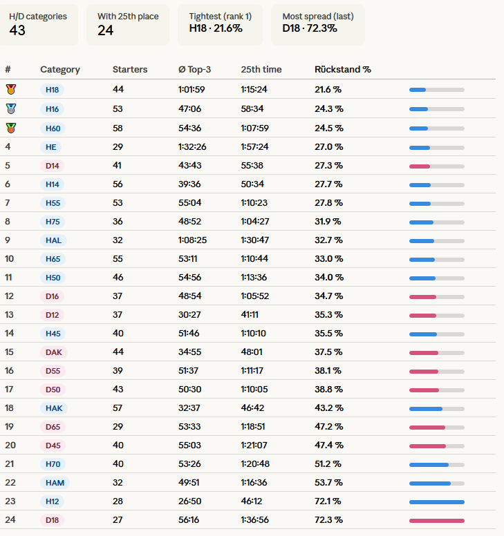 Beeindruckt von der Leistungsdichte an der Spitze meiner Kategorie H50 am Nationalen vom letzten Sonntag, habe ich mich gefragt, in welcher Kategorie es wohl die beste relative Leistung braucht um den letzten Punkt (25.Rang) zu erreichen.Im Anhang das Resultat (claude.ai hat den parser geliefert, 100% ist die Mittelzeit der Top 3)