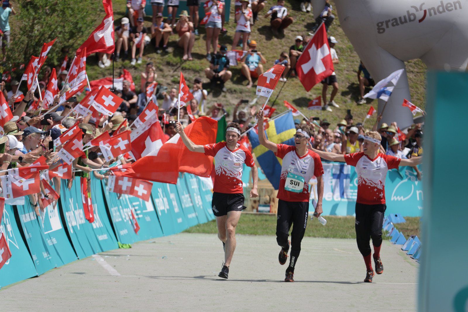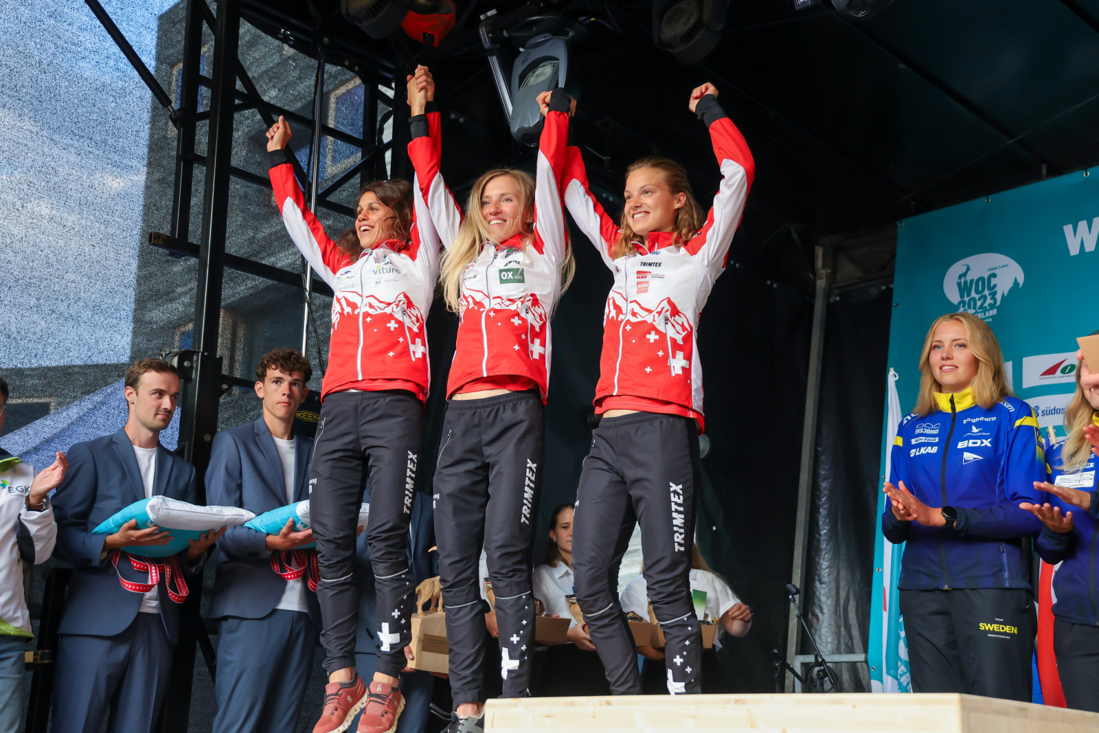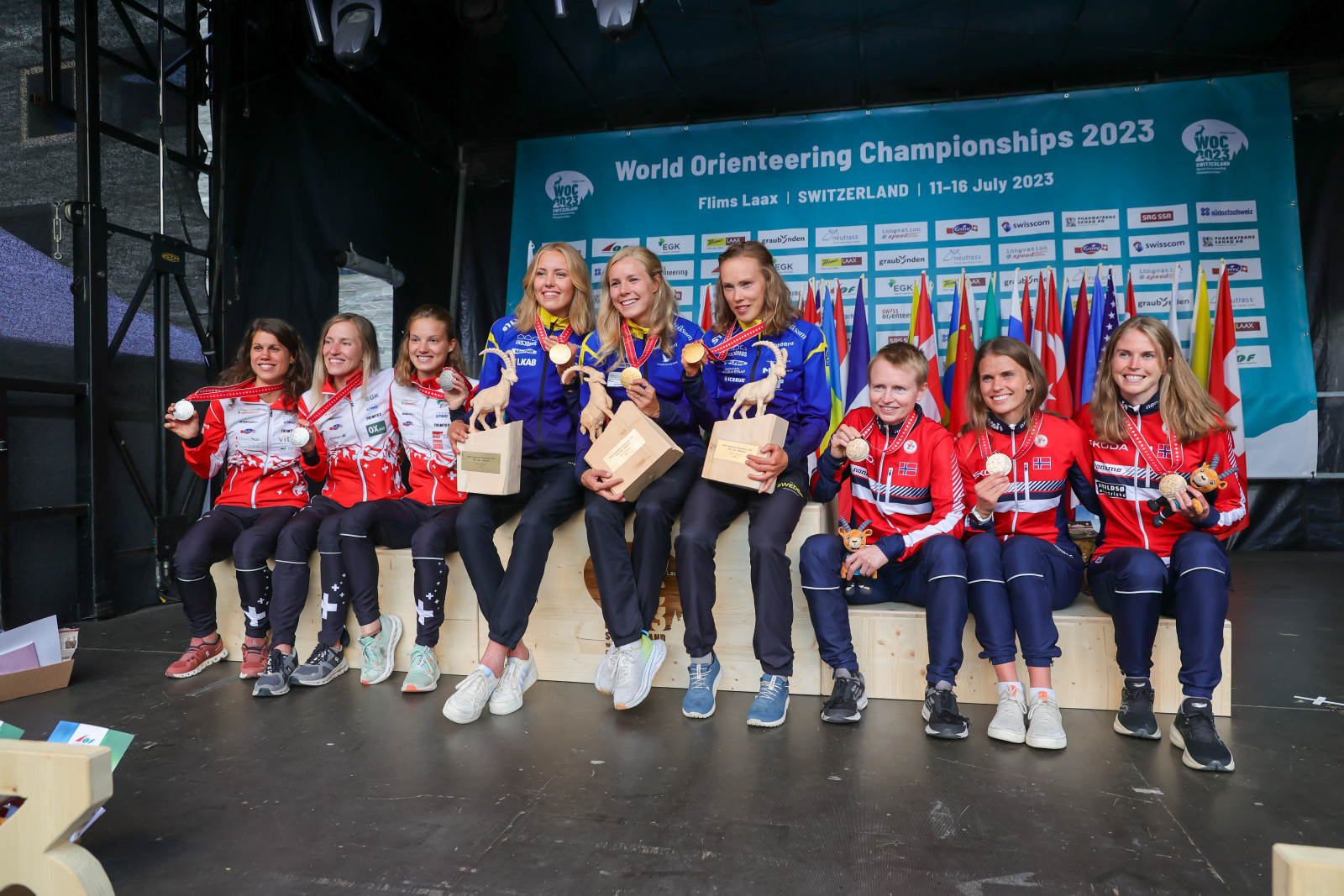 WOC2023T2 010967 FLIMS-LAAX/SWITZERLAND, 16.07.2023 - FLTR: Switzerland (2nd), Sweden (1st) and Norway (3rd), captured during the Medal Ceremony for the Relay at the World Orienteering Championship 2023 in Flims Laax / Switzerland. copyright by steineggerpix.com + woc 2023 / photo thomi studhalter