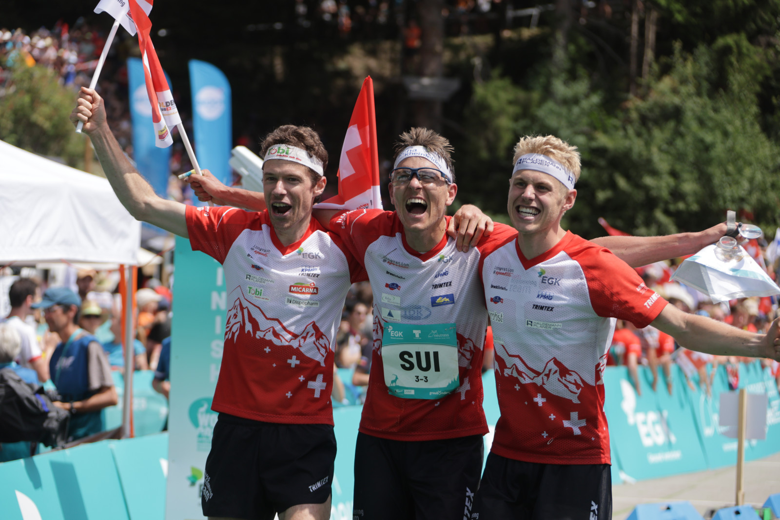 • FLIMS-LAAX/SWITZERLAND, 16.07.2023 - Men Team Switzerland winning the Gold Medal, FLTR: Daniel Hubmann, Joey Hadorn and Matthias Kyburz, captured during the Medal Ceremony for the Relay at the World Orienteering Championship 2023 in Flims Laax / Switzerland. copyright by steineggerpix.com + woc 2023 / photo remy steinegger