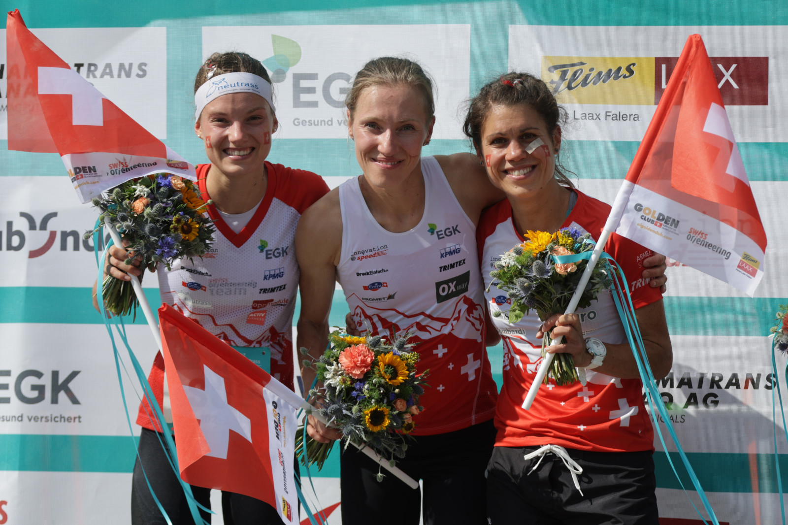 WOC2023T2 010854 FLIMS-LAAX/SWITZERLAND, 16.07.2023 - 2nd Place Switzerland FLTR: Elena Roos, Natalia Gemperle and Simona Aebersold, captured during the Medal Ceremony for the Relay at the World Orienteering Championship 2023 in Flims Laax / Switzerland. copyright by steineggerpix.com + woc 2023 / photo thomi studhalter