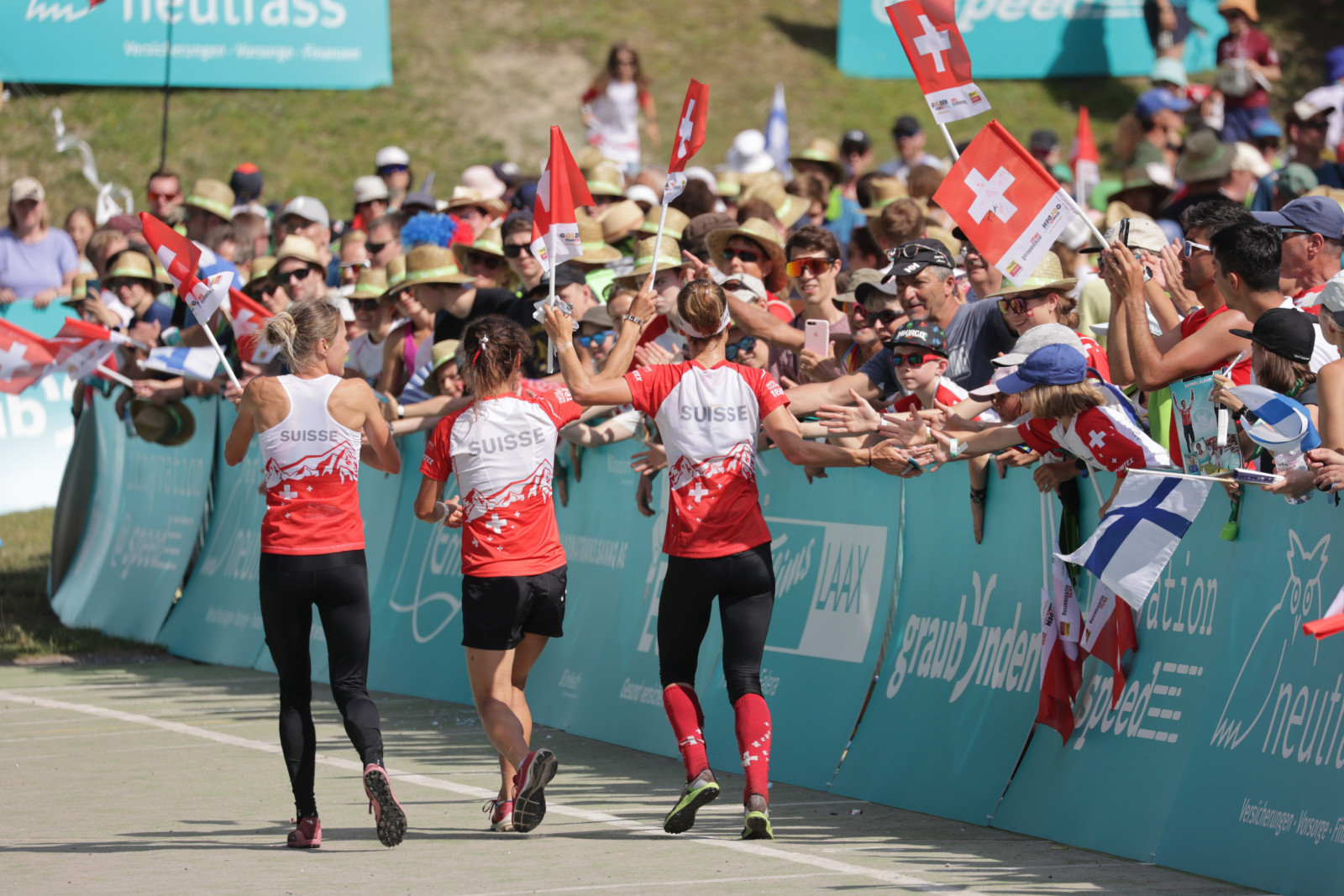 WOC2023R1 011055 FLIMS-LAAX/SWITZERLAND, 16.07.2023 - FLTR: Simona Aebersold, SUI, Natalia Gemperle, SUI and Elena Roos, SUI, captured during the Relay at the World Orienteering Championship 2023 in Flims Laax / Switzerland. copyright by steineggerpix.com + woc 2023 / photo remy steinegger